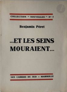 PÉRET (Benjamin). …Et les seins mouraient… Édition ornée d'un frontispice par Miró. Marseille : Les Cahiers du Sud, [1929]. —In-12, broché. Édition originale rare. UN DES 10 PREMIERS EXEMPLAIRES SUR MADAGASCAR. Exemplaire parfaitement conservé, non coupé. Quelques rousseurs éparses.