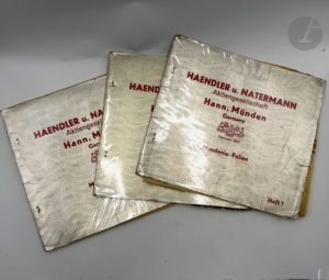 [PUBLICITÉ]. Haendler u. Natermann Aktiengesellschaf. Hann.Münden Germany. S.l., vers 1930. —3 albums in-folio oblong, en feuilles ou agrafé, sous couverture papier argenté, emboîtage cartonné de l'éditeur. Ensemble très rare de 3 albums de présentations d'échantillons de papier d'emballage en aluminium de la société allemande Haendler et Natermann, entreprise fondée en 1825. Ces albums portent respectivement les numéros 1, 3 et 4. Il manque au moins le second. Ils réunissent plus de 100 grands échantillons, la plupart ne présentant aucun manque. Une dizaine environs sont partiels ou déchirés. Exemplaires incomplets de plusieurs échantillons mais on ne saurait donner le nombre. Nous n'avons trouvé aucun autre exemplaire de ces albums. Sans les agrafes au premier album. Une seule agrafe est encore présente dans l'album numéro 4. Traces de pliures aux couvertures. Rousseurs éparses aux feuillets intercalaires et déchirures à certains d'entre eux. Emboîtage abîmé.