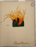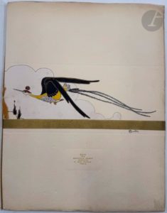 [PUBLICITÉ - MODE] - DEMAY (Marcelle). La Mode en mil neuf cent douze. Paris, 1912. — In-4, relié à l'aide d'une cordelette de soie jaune. Superbe album imprimé par Draeger frère et édité par la modiste Marcelle Demay pour présenter sa collection 1912 ; il est considéré comme l’un des plus beaux catalogues sur les chapeaux jamais réalisés. Dédié à la comédienne Berthe Cerny, il est illustré de 5 photographies de cette dernière, dont 4 par Talbot et une par Vizzavona d’après un tableau de Jules Cayron, ainsi que de 5 très beaux pochoirs, dont un sur la couverture, et de 8 ornements (2 en noir et 6 en jaune) par Charles MARTIN. Exemplaire très bien conservé, sans la couverture de protection transparente de l'éditeur.