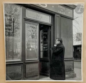 [QUENEAU (Raymond)] - ZALEWSKI (Maurice). Photographie prise dans les années 50, représentant Raymond Queneau (1903-1976) songeur devant l'agence NL du Crédit lyonnais à Neuilly. Photographie argentique d'époque, en noir et blanc, 175 x 175 mm, sous passe-partout. Cachet rouge du photographe au verso.