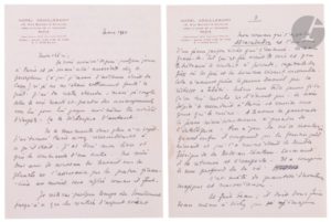 SACHS (Maurice). Abracadabra. Roman. Paris : Gallimard, [1952]. — In-8, broché. Édition originale. UN DES 65 EXEMPLAIRES NUMÉROTÉS SUR VÉLIN PUR FIL DES PAPETERIES LAFUMA-NAVARRE, seul tirage sur grand papier. Exemplaire parfaitement conservé, enrichi d'une très belle lettre autographe signée de l'auteur, quatre pages in-12, datée de mars 1940 sur papier en-tête de l'hôtel Vouillemont à Paris et adressée à sa grand-mère qu'il appelle « Mon chéri ». Sachs vient d'arriver à Paris et prévient sa grand-mère qu'il va s'occuper de son arriéré d'impôts. Il écrit sur ses projets parisiens et littéraires, notamment sur son roman Abracadabra dont il débute la rédaction : « Mon roman qui s'appelle Abracadabra est l'histoire d'un jeune garçon riche qui s'ennuie. Le nain Grain-de-Sel qui est fée vient le voir et pour le distraire le conduit à Joconde, capitale des fées où les fées et les hommes vivent ensemble. Cela n'amuse guère le jeune Daniel que la richesse a abêti. Même une belle jeune fille qu'on lui montre ne l'émeut pas. Le nain dépité le reconduit à Paris et suscite une grue qui le ruine. À travers la pauvreté le jeune niais commence à prendre de l'intelligence. Peu à peu la vie se revalorise quand enfin il comprend que la femme qu'il aimait et qui l'a ruiné était le double féérique de la Belle-au-Château-Dormant il la retrouve et l'emporte. Il a compris le sens profond de la vie. C'est mêlé de quantité d'aventures magiques et merveilleuses. » Il poursuit en parlant de Vichy où sa grand-mère se trouve : «Mon ami Alquié qui y va tous les ans pour faire l'amour avec les dames qui font la cure et s'ennuient me dit que c'est un paradis de l'aventure. » Il termine sa lettre en écrivant : « Je t'embrasse // ton grand père // Maurice. »