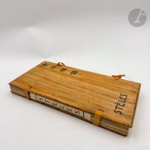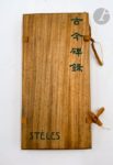 SÉGALEN (Victor). Stèles. Péking : pour Georges Crès & Cie, 1914. —In-4 allongé, en feuilles pliées à la chinoise, sous deux plaques de bois, la première comprenant le titre gravé en chinois et en français, tenues à l'aide de deux liens de tissus jaune. Seconde édition, en partie originale, la première en librairie. Elle comprend 16 stèles qui ne figuraient pas dans l'originale de 1912. Tirage limité à 640 exemplaires. Un des 570 sur vergé feutré, complet de la bande de papier feutré comportant le titre. Exemplaire très bien conservé malgré quelques rousseurs éparses.