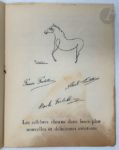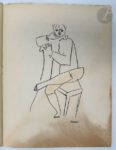 [UNION DES ARTISTES RUSSES]. Grand Bal des artistes. Travesti transmental. Paris : Union des artistes russes, 1923. —In-4, agrafé. Rare programme du Bal travesti transmental organisé par l'Union des artistes russes au profit de la caisse de secours des artiste, donné à la salle Bullier le 23 février 1923. Ce bal est considéré comme l'une des plus célèbres et des plus importantes manifestations du dadaïsme. Imprimé par François Bernouard, il est imprimé sur papier vélin et illustré de compositions de Picasso, Gontcharova, Juan Gris, Derain, etc. On y trouve également la reproduction de poèmes de Tristan Tzara, Vincente Huidobro, Halina Izdebska etc. Mouillure ayant bruni le bas de chaque page. Déchirure sans manque au bas des feuillets. Des feuillets dégrafés.