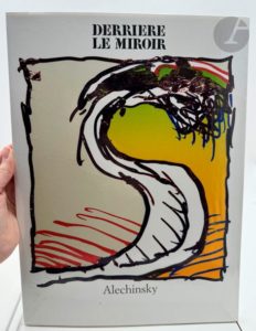 ALECHINSKY (Pierre). Derrière le miroir. Alechinsky. Paris : Maeght éditeur, 1981. — In-folio, en feuilles, sous chemise et étui cartonnés de l'éditeur. Numéro 247 de «Derrière le miroir », publié à l'occasion de l'exposition consacrée à l'artiste par la Galerie Maeght en octobre 1981. Il comprend 6 illustrations originales en couleurs en offset, dont deux sur double page, et 14 reproductions en noir. Un des exemplaires hors commerce sur vélin d'Arches, justifié et signé par Alechinsky à la justification, tirage en sus des 150 exemplaires numérotés sur le même papier. Exemplaire parfaitement conservé.