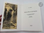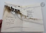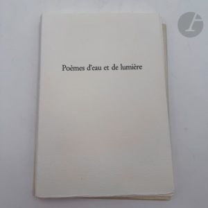 BALTAZAR (Julius) - MIZON (Luis). Poèmes d'eau et de lumière traduit de l'espagnol par Zéno Bianu en collaboration avec l'auteur. [Neuilly-sur-Seine] : Al Manar, [2007]. —In-8, en feuilles, couverture rempliée. Édition originale illustrée de deux lithographies de Julius BALTHAZAR (né en 1949) tirées sur Japon Atsukushi naturel et collées à pleine page. UN DES 50 PREMIERS EXEMPLAIRES NUMÉROTÉS SUR VÉLIN D'ARCHES, signés par l'auteur, le traducteur et l'artiste à la justification, et enrichis d'une encre originale de Balthazar, rehaussée d'aquarelle et de crayon arlequin, et revêtue par Mizon d'un fragment de poème autographe. Exemplaire très bien conservé.