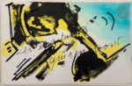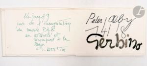 BERTINI (Gianni) - AEBY (Peter). Gerbino. Alès : PAB, 1989. —In-12 oblong, en feuilles, couverture rempliée. Maquette originale de cet ouvrage illustré ici de 6 compositions en couleurs de Gianni BERTINI (1922-2010). Il est justifié 18/30 et signé par Bertini et l'auteur Peter Aeby (i.e. Pierre-André Benoît). L'artiste a ajouté en tête cette précision : «14. jan. 89 // jour de l'inauguration // du musée P.A.B. // ex. retouché et // recomposé à la // main // G. Bertini. » Exemplaire bien conservé.