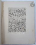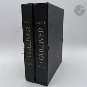 BOFA (Gus) - SWIFT (Jonathan). Voyages de Gulliver. Bruxelles : Éditions du Nord, 1929. — 2 volumes in-4, broché, couverture rempliée, chemise et étui de l'éditeur. Charmante édition tirée à 360 exemplaires, très joliment illustrée par Gus BOFA (1883-1968). Elle comprend une composition en noir sur chacune des couvertures, 36 culs-de-lampe en couleurs et 30 eaux-fortes originales hors texte. Un des 320 exemplaires sur Hollande. Défauts aux chemises. Rousseurs éparses.