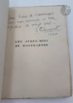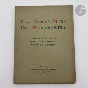CHIMOT (Édouard) - BAUDU (René). Les Après-Midi De Montmartre. Paris : pour le compte des auteurs, 1919. —In-4, broché, couverture rempliée. Édition recherchée car il s'agit du premier ouvrage illustré par Édouard CHIMOT (1880-1959), comprenant 14 belles eaux-fortes originales à pleine page et dans le texte sous serpente légendée. Tirage limité à seulement 170 exemplaires, celui-ci faisant partie des 100 sur vélin à la forme. Envoi autographe signé de l'illustrateur sur le faux titre : « Pour Marie de Lauwereyns // avec mon souvenir et mon affection de vingt ans… // E Chimot // 1920. » Exemplaire très bien conservé.