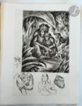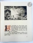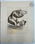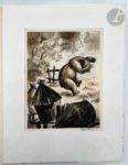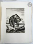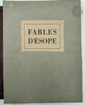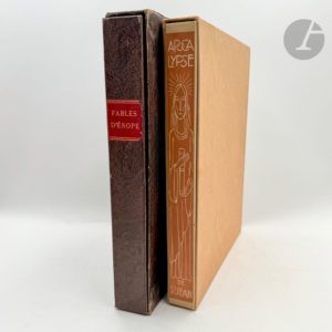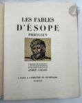 COLLOT (André) - ÉSOPE. Les Fables d'Ésope phrygien. Enrichies de quatrains à la fin de chaque discours. Paris : À l'emblème du secrétaire, 1941. —In-4, en feuilles, couverture rempliée, chemise et étui de l'éditeur. Belle édition tirée à 242 exemplaires, illustrée de 21 vignettes d'animaux gravés sur bois et de 21 belles eaux-fortes à pleine page d'André COLLOT (1897-1976). UN DES 12 EXEMPLAIRES SUR JAPON NACRÉS, RÉSERVÉS À L'ARTISTE, SIGNÉS PAR COLLOT À LA JUSTIFICATION. Celui-ci est enrichi, sur le même papier, d'une suite des eaux-fortes avec remarques et d'une suite des bois en deux états. Il comprend également 3 DESSINS ORIGINAUX SIGNÉS ayant servi à l'illustration du livre, et un cuivre original encré pour la « Fable des taureaux et du lion ». Exemplaire très bien conservé malgré quelques légers défauts d'usage à l'étui et de rares rousseurs sur le bord de quelques feuillets. On joint, illustré par le même artiste : - Apocalypse de Saint Jean. Paris : Aux dépens de bibliophiles amis de l’artiste, 1942. — In-4, en feuilles, couverture rempliée, chemise et étui de l'éditeur. Édition illustrée de 25 eaux-fortes originales et de bois gravés d’André COLLOT. Tirage limité à 276 exemplaires ; un des 220 sur vélin de Vidalon. Exemplaire bien conservé. Transfert des couvertures sur les gardes.