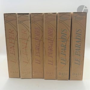 DALI (Salvador) - DANTE ALIGHIERI. La Divine comédie. Illustrations de Dali. Paris : Les Heures claires, 1959-1963. —6 volumes in-folio, en feuilles, sous chemise et étui d’édition. Célèbre édition de la « Divine comédie » dans la traduction de Julien Brizeux, illustrée de 100 aquarelles en couleurs à pleine page de Salvador DALI (1904-1989), reproduites par les soins de Raymond Jacquet avec la collaboration de Jean Taricco. Tirage à 4765 exemplaires sur vélin pur chiffon de Rives ; celui-ci est l’un des 3900 numérotés de 866 à 4765. Les illustrations sont comprises dans la pagination. Celles correspondant aux pages 21 et 65 dans «L'Enfer I », à la page 89 de « L'Enfer II », aux pages 35 et 151 dans « Le Purgatoire II » ont été retirées de l'exemplaire et placées sous verre. Dos des étuis brunis. L'illustration de la page 167 dans le second volume du Paradis a été anciennement encadrée, les bords dont brunis. Les 5 illustrations encadrées sont passées.