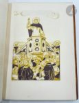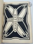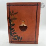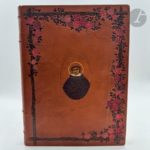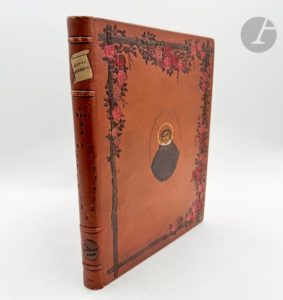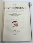 DENIS (Maurice) - LACORDAIRE (Le R. P. Henri-Dominique). Vie de saint Dominique. Introduction du R.P. Marie-Albert Janvier. Illustrations de Maurice Denis. Paris : Jacques Beltrand, 1919. — In-4, maroquin fauve, premier plat orné d'un encadrement florale à froid et mosaïqué de maroquins marron, rouge et rose, portrait de Saint Dominique mosaïqué en médaillon au centre, second plat orné d'un encadrement de branches de maroquin marron et d'une grande branche de citronier (?) de maroquin vert, olive et ocre, portrait mosaïqué de Lacordaire en médaillon au centre, dos à nerfs orné de motifs mosaïqués, maroquin fauce en encadrement à l'intérieur, orné de trois filets dorés, tranches dorées, couverture et dos conservés (Chopin, Ad. Leroy dor.). Belle édition illustrée de 59 figures en couleurs gravées sur bois par Jacques Beltrand d’après les dessins de Maurice DENIS, dont 20 grandes compositions et 22 bandeaux. L’ouvrage devait paraître à l’occasion du septième centenaire de l’approbation de l’Ordre des Frères Prêcheurs par le pape Honorius III, mais sa parution fut retardée de deux années à cause de la guerre. Tirage strictement limité à 330 exemplaires numérotés et réservés aux souscripteurs et collaborateurs. Celui-ci est enrichi de cet envoi autographe signé du graveur : « à Monsieur l'abbé Martin // Hommage respectueux et sympathique // Jacques Beltrand. » Très bel exemplaire relié à l'époque ou légèrement postérieurement par Pierre Chopin et Adrien Leroy. Quelques frottements d'usage au dos.