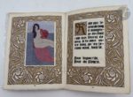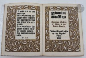 DOMIN (André) - GOURMONT (Remy de). Litanies de la Rose. Paris : Éditions René Kieffer, 1919. — In-16, broché, couverture rempliée. Belle édition de luxe, la première illustrée, ornée de 59 compositions coloriées au pochoir à pleine page, d’un encadrement gravé sur bois tiré en bistre sur fond or à chaque page et de lettrines gravées de même, par le décorateur, illustrateur et critique d'art André DOMIN (1883-1962). Tirage à 560 exemplaires ; un des 500 sur vélin. Deux cassures au dos. Très bon état intérieur.