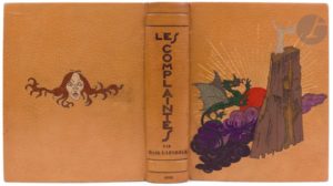 DRAINS (Geo A.) - LAFORGUE (Jules). Les Complaintes. Paris : Éditions du Sagittaire, Simon Kra, [1923]. — In-4, maroquin beige, chaque plat est orné d'une composition mosaïquée différente s'inspirant de deux illustrations du livre, celle du premier plat figurant un dragon au pied d'un rocher sur lequel se tient un homme les bras levés, et celle du second plat représentant la tête d'une vieille femme, dos à deux nerfs orné du titre du livre en lettres mosaïquées de maroquin brun, bandes de maroquin grenat, noir, violet et beige en encadrement à l'intérieur, doublures et gardes de soie moirée orange, doubles gardes, tête dorée, non rogné, couverture et dos conservés, étui (Franz). Belle édition tirée à 500 exemplaires, illustrée de cent-quarante lithographies originales de Geo A. DRAINS, dont une en couleurs en frontispice et trente-neuf en sanguine en cul-de-lampe, en tête de chapitre débordant sur le texte ou à pleine page. Le titre n'annonce que cent-vingt-huit lithographies. Un des 25 premiers exemplaires sur papier impérial du Japon, celui-ci faisant partie des quinze comprenant une suite en noir sur chine collé des lithographies. On compte cent-trente-neuf épreuves sur chine, il manque celle de la page 8. Cela semble commun, les autres exemplaires pour lesquels nous avons trouvé une collation précise, possèdent également une suite de cent-trente-neuf des cent-quarante lithographies. Splendide exemplaire en reliure mosaïquée de Franz qui a reproduit sur les plats les lithographies des pages 216 et 93 ; il a été enrichi de deux états supplémentaires sur chine du frontispice. Il semble manquer la chemise, bords de l'étui fendus. L'épreuve sur chine de la lithographie de la page 166 a été reliée entre les pages 170 et 171.