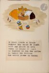 [ENFANTINA - MANUSCRIT]. Ribambelles. S.l., s.d. [vers 1950]. —In-4, en feuilles, couverture rempliée. Joli livre pour enfants entièrement manuscrit mettant en scène Claude et Liliane. Il se compose d'une couverture et de 24 feuillets comprenant une partie textuelle et un dessin original à l'aquarelle, à l'exception du troisième feuillet où le texte a été copié à la machine puis collé. Ce manuscrit semble inédit, peut-être réalisé pour un usage privé. Couverture brunie sur les bords, quelques petites déchirures sans manque sur les bords.