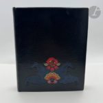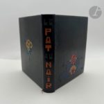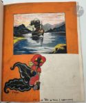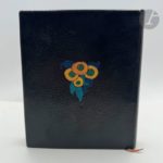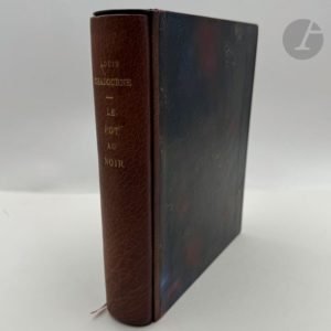 FALKÉ (Pierre) - CHADOURNE (Louis). Le Pot au noir. Scènes et Figures des Tropiques. Paris : G. et A. Mornay, 1922. — In-8, maroquin noir, composition florales différentes mosaïquées de différents maroquins sur les plats, celle du premier plat étant placée sur le bas et celle sur le second plat au centre, ces deux compositions s'inspirant de l'illustration du livre ; dos lisse portant le titre en long en lettres mosaïquées de maroquin vert et havane, tête dorée, non rogné, couverture et dos conservés, chemise à dos de maroquin brun et à recouvrement, étui (L. Loir et H. Lehaye). Cet ouvrage est le premier paru dans « La collection originale » des éditions Mornay. Tiré à 1077 exemplaires, il est illustré de nombreuses compositions gravées sur bois en couleurs par Pierre FALKÉ (1884-1947), dont 6 à pleine page. Un des 757 exemplaires sur vélin de Rives à la forme. Celui-ci a été revêtu d'une très belle reliure originale mosaïquée de L. Loir. Le décor, s'inspirant des compositions de Falké, a été dessiné par H. Lehaye. La gouache originale ayant servi au décor de la reliure, a été ajoutée en tête. Elle représente sur la partie supérieure un bateau navigant dans un décor de montagnes et sur la partie inférieure la moitié gauche du décor reproduit sur le premier plat. Dos de la chemise passé.