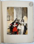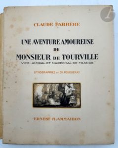 FOUQUERAY (Charles) - FARRÈRE (Claude). Une aventure amoureuse de monsieur de Tourville vice-amiral et maréchal de France. Paris : Ernest Flammarion, [1930]. —In-4, broché, couverture rempliée. Édition peu courante, tirée à 275 exemplaires, illustrée de 40 lithographies de Charles FOUQUERAY (1869-1956) dont 15 hors texte en couleurs. Un des 25 exemplaires hors commerce, imprimé sur papier vélin de Rives, enrichi de cet envoi autographe signé de l'auteur adressé au romancier Max Fischer (1880-1957) et à son épouse l'actrice Madeleine, connut sous le nom de scène de Madeleine Céliat : «pour Madeleine et pour Max Fischer // avec toute ma vraie amitié // Claude Farrère. » Cette provenance est ici très intéressante dans la mesure où Max Fischer était le directeur des Éditions Flammarion qui publièrent l'ouvrage. Déchirures sans manque en haut du dos. Rousseurs.
