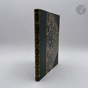 HUARD (Charles) - BÉJOT (Eugène) - GEFFROY (Gustave). Les Bateaux de Paris. Paris : Ch. Bosse, 1903. — In-8, demi-chagrin vert foncé à coins, filets dorés, dos à nerfs orné, tête dorée, non rogné, couverture conservée (reliure de l'époque). Édition originale de cet ouvrage des plus réussis, illustrée de 25 compositions dont 15 eaux-fortes originales par Charles HUARD, y compris celle en couleurs sur la couverture, et 10 dessins d'Eugène BÉJOT gravés sur bois par Jacques Beltrand. Tirage à 184 exemplaires numérotés ; celui-ci est l'un des 25 sur japon impérial, comprenant une suite des eaux-fortes sur le même papier. Cette suite comprend les épreuves des 14 gravures qui sont dans le texte. Celle de la couverture n'y figure pas. Bon exemplaire enrichi de prospectus de parution relié en tête. Dos légèrement passé.