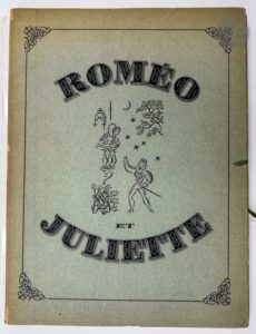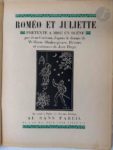 [HUGO (Jean)] - COCTEAU (Jean). Roméo et Juliette. Prétexte à mise en scène par Jean Cocteau, d'après le drame de William Shakespeare. Décors et costumes de Jean Hugo. Paris : Au sans pareil, 1926. — In-4, broché, couverture rempliée, sous chemise cartonnée et illustrée de l'éditeur. Édition originale tirée à 432 exemplaires, de cette pièce en 5 actes et 23 tableaux composée par Jean Cocteau d'après William Shakespeare. Elle fut représentée pour la première fois aux Soirées de Paris organisées sous la direction du Comte Étienne de Beaumont, le lundi 2 juin 1924 au théâtre de la Cigale. L'édition est illustrée de 21 gravures originales de Jean HUGO (1894-1984), auteur des décors et des costumes de la pièce, dont 13 hors texte. À l'exception de la figure sur le titre, toutes les compositions ont été coloriées à la main sous la surveillance de l'artiste. Un des 350 exemplaires sur vélin Montgolfier d'Annonay. Quelques manques aux charnières de l'étui.
