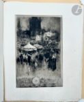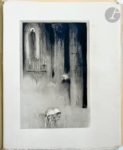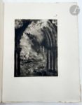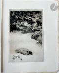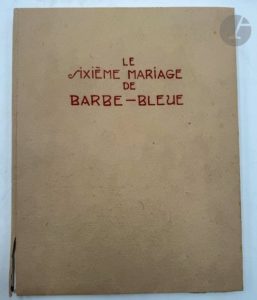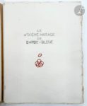 ICART (Louis) - RÉGNIER (Henri de). Contes à soi-même. Le Sixième mariage de Barbe-Bleue. Paris : Le Livre d'Artiste, Le Vasseur et Cie, 1938. —In-4, en feuilles, couverture rempliée, chemise et étui de l'éditeur. Très belle édition calligraphiée et illustrée de 45 compositions en noir, le tout gravé par le peintre et graveur Louis ICART (1888-1950). Tirage limité à 200 exemplaires ; celui-ci est l'un des 45 sur papier d'Auvergne à la main, contenant une suite de toutes les planches gravées, avec remarques, et un cuivre doré et encré. Déchirure sans manque à une charnière de la couverture. Tache dans la marge inférieure de 4 planches de la suite. Rousseurs marginales sur les gardes et le bord de quelques feuillets.