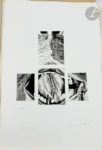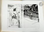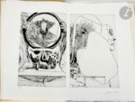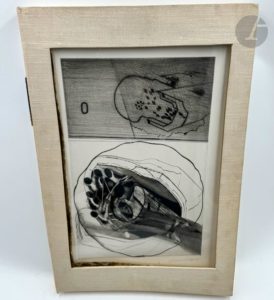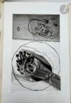 IPOUSTÉGUY - LEBEL (Robert). Léonard de Vinci ou La fin de l'humanité. Paris : Le Soleil noir, [1974]. —In-8, broché, couverture rempliée, sous emboîtage in-folio à fenêtre et à compartiment de l'éditeur. Nouvelle édition illustrée notamment de la reproduction des 23 pointes sèches réalisées par IPOUSTÉGUY (1920-2006) pour cet essai de Robert Lebel sur Léonard de Vinci. Un des 120 exemplaires de tête sur vélin de Lana, signés par l'auteur à la justification, celui-ci faisant partie des 100 numérotés en chiffres arabes, dans un emboîtage spécialement conçu par l'atelier Jean Duval, contenant la totalité de la suite originale des pointes sèches tirées sur vélin de Rives, chaque planche étant numérotée et signée par l'artiste. Le plastique au premier plat est en partie gondolé et défait. Épidermures à la pièce de titre au dos.