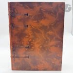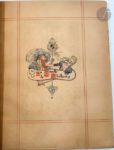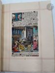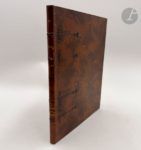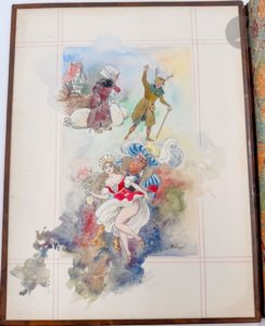 LEBÈGUE (Léon) - BALZAC (Honoré de). La Pucelle de Thilhouze conte drolatique par de Balzac. Paris : Ch. Carrington, 1901. —In-8, veau jaspé, motifs à froid sur le bord des plats dessinant comme des lanières venant en continue des nerfs, dos à nerfs, dessins originaux collés sur les doublures, tête dorée, non rogné, couverture conservée, étui (reliure de l'époque). Édition illustrée sur la couverture et à chaque page du livre d'une ou de plusieurs compositions en couleurs de Léon LEBÈGUE (1863-1944). Tirage limité à 220 exemplaires, celui-ci faisant partie des 200 pour les souscripteurs, comprenant une suite des illustrations sur papier de Chine. Exemplaire enrichi de deux superbes aquarelles originales signées de l'artiste, collés sur les contreplats. Ces dessins sont en rapport avec l'histoire mais n'ont pas été reproduits dans le livre. Dos légèrement passé et quelques frottements d'usage. Quelques rousseurs sur les gardes et sur la suite. Recto du premier feuillet bruni par la couverture.