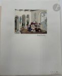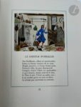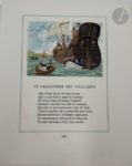 LEMARIÉ (Henry) - LA FONTAINE (Jean de). Contes. Paris : Rameau d'or, s.d. —2 volumes in-8, en feuilles, couverture rempliée, chemise et étui de l'éditeur. Édition illustrée de 123 compositions en couleurs de Henry LEMARIÉ (1911-1991) dont deux sur la couverture, deux vignettes de titre, 62 têtes de chapitre et 57 culs-de-lampe. Exemplaire d'artiste, justifié par Lemarié, enrichi d'une aquarelle originale signée ayant servi à l'illustration (II, page 185) et cet envoi autographe signé : «à // Monsieur // Staquet // ces “Contes” de // La Fontaine // en très cordial hommage // Henry Lemarié. » Quelques défauts d'usage aux chemises.