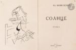 [LITTÉRATURE RUSSE] - MAÂKOVSKIJ (Vladimir Vladimirovič) - LARIONOV (Mihail Fedorovič). Солнце : Поэма. [Soleil : poème]. Mockba : Круг [Moscou : Cercle], 1923. — In-16, broché. Édition originale de ce poème futuriste de l'écrivain et poète russe Vladimir Vladimirovič Maâkovskij (1893-1930). Elle a été illustrée de 9 compositions de l'artiste d'avant-garde russe Mihail Fedorovič Larionov (1881-1964), dont une en deux couleurs sur la couverture et 8 en noir (7 à pleine page et une dans le texte). Le tirage a été limité à 5000 exemplaires. En dépit de ce fort tirage, les exemplaires sont peu courants, surtout en bon état de conservation. Celui-ci est très bien conservé malgré quelques légères salissures à la couverture et de petites déchirures marginales sur les bords.