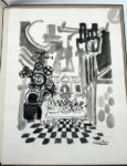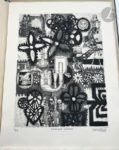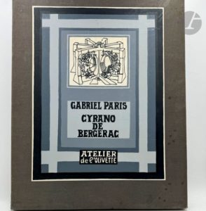 PARIS (Gabriel) - CYRANO DE BERGERAC (Savinien). 10 eaux-fortes de Gabriel Paris. Textes de Cyrano de Bergerac. S.l. : Atelier de l'Olivette, 1977. — Album grand in-folio, en feuilles, sous emboîtage de l'éditeur. Grand album de 10 eaux-fortes originales du peintre et poète Gabriel PARIS (1924-2000), gravées sur acier de 1975 à 1977. L'édition a été tirée à 47 exemplaires sur papier vélin d'Arches, avec les 10 eaux-fortes signées, légendées et numérotées par l'artiste. Elle débute par 4 pages de textes de Cyrano de Bergerac, qui avaient été calligraphiés sur soie puis tirés à la main en sérigraphie. UN DES 7 PREMIERS EXEMPLAIRES ENRICHIS D'UN GRAND DESSIN ORIGINAL SIGNÉ DE L'ARTISTE, au format du livre. Quelques défauts d'usage et taches à l'emboîtage.
