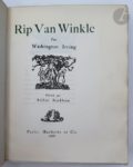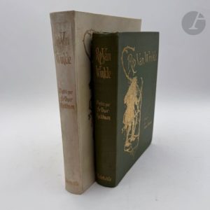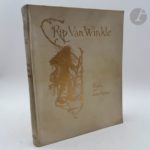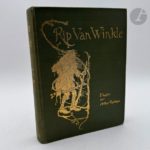 RACKHAM (Arthur) - IRVING (Washington). Rip Van Winkle. Paris : Hachette et Cie, 1906. — In-4, parchemin rigide d’édition, orné de fers spéciaux dorés sur le premier plat et le dos, tête dorée, non rogné. Édition illustrée par Arthur RACKHAM (1867-1939) de vignettes en noir et de 50 planches en couleurs contrecollées sous serpente légendée, dont une en frontispice. Un des 200 exemplaires numérotés sur papier Whatman. Restauration à la partie supérieure du dos, ayant partiellement effacé le nom de l'auteur. Manque les liens. - On joint le même titre paru la même année avec les mêmes illustrations, au format grand in-8 et en cartonnage vert de l'éditeur, non numéroté, bien conservé malgré quelques minimes défauts au cartonnage.