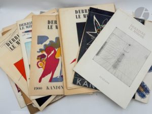 [REVUE] - DERRIÈRE LE MIROIR. Derrière le miroir. Paris : Pierre à feu, [puis] Maeght, 1948-1981. — 35 fascicules in-folio, en feuilles. Collection de 26 numéros en première édition de « Derrière le miroir » : - N° 7, février 1948, Jean Villeri. - N° 8, mars 1948, Jean Peyrissac. - N° 9, avril 1948, Pierre Pallut. - N° 31, juillet 1950, Calder. - N° 32, octobre 1950, « Les Mains éblouies ». - N° 33, novembre 1950, Arp (pliure centrale horizontale. Pliure au dos déchirée). - N° 34, décembre 1950, Raoul Ubac. - N° 42, novembre-décembre 1951. Kandisky 1900 1910 (déchirures au dos et sur les bords de la couverture. Joints coupures de journaux et manuscrits anonymes). - N° 43, février 1952, Bram van Velde. - N° 48-49, juin-juillet 1952, G. Braque (minimes rousseurs sur les bords de la couverture). - N° 50, octobre 1952, « Tendance octobre 1952 ». - N° 52, février 1953, Lam. - Autre exemplaire du n° 52 (dos bruni). - N° 53-54, mars-avril 1953, Steinberg (déchirures et taches à la couverture). - N° 101-102-103, septembre, octobre et novembre 1957, Kandinsky. - N° 138, mai 1963, « Georges Braque Papiers collés 1912-1914 » (déchirures au dos et au bord de la couverture). - N° 154, novembre 1965, «Kandinsky. Bauhaus de Dessau 1927-1933» (déchirures au dos). - N° 166, juin 1967, «G. Braque. Derniers messages » (déchirures au dos). - N° 195, décembre 1971, (artistes multiples) (déchirures au dos, un coin plié). - N° 205, septembre 1973, Steinberg 1973. - N° 216, novembre 1975, Bram van Velde. - N° 231, novembre 1978, Miró. - N° 223, mars 1977, Arakawa (envoi autographe signé de l'artiste, en japonais, en seconde de couverture). - N° 236, décembre 1979, Kienholz (petite déchirure aux extrémités du dos). - N° 245, mai 1981, « Noguchi, Granits, basaltes, obsidiennes» (légères rousseurs à la couverture). - N° 247, (octobre 1981, Alechinsky (rousseurs à la couverture). On joint les 9 numéros suivants, en seconde édition : - N°1, [décembre 1946], «Le Noir est une couleur ». - N° 2, [février-mars 1947], «Sur 4 murs 1947 ». - N° 3, [avril-mai 1947], Rigaud. - N° 5, [octobre 1947], « Les Mains éblouies ». - N° 6, [Novembre 1947], « Exposition Baya ». - N° 10, [Mai 1948], E. Béothy. - N° 11-12, [juin 1948], Bram et Geer van Velde. - N° 13, [1948], Germaine Richier. - N° 32, [octobre 1950], «Les Mains éblouies »