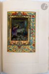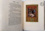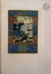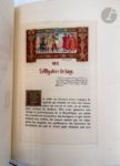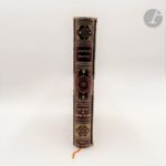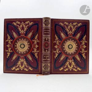 ROCHEGROSSE (Georges) - FRANCE (Anatole). Le Puits de Sainte Claire. Paris : A. Ferroud, F. Ferroud Successeur, 1925. —Grand in-8, maroquin bordeaux, rosace dorée et mosaïquée dans un cadre de maroquin havane sur les plats, dos à nerfs orné de motifs dorés et mosaïqués, dentelle dorée en encadrement à l'intérieur, doublures et gardes de soie moirée bordeaux, doubles gardes, tête dorée, non rogné, couverture et dos conservés, étui (A. Laucournet). Édition tirée à 650 exemplaires, illustrée de nombreuses compositions de Georges ROCHEGROSSE (1859-1938), dont 1 frontispice et 13 hors texte, gravées à l'eau-forte en couleurs par Eugène Decisy. Un des 470 exemplaires sur vélin d'Arches, très bien relié à l'époque par Antoine Laucournet. Petits frottements touchant le cadre sur les plats, sinon exemplaire très bien conservé.