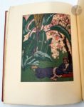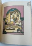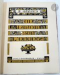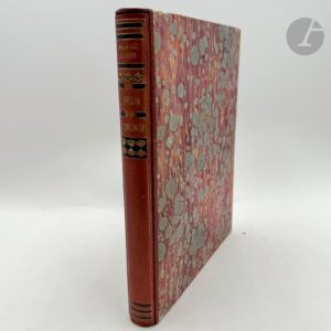 SURÉDA (André) - BARRÈS (Maurice). Un jardin sur l'Oronte. Paris : Javal & Bourdeaux, 1927. —In-4, maroquin orange, plats recouverts de papier liège, dos lisse orné de bandes de maroquin noir et de motifs floraux dorés et mosaïqués de maroquin noir, doublures et gardes de papier bois, tête dorée, non rogné, couverture et dos conservés, étui (H. Duhayon). Charmante édition illustrée de 16 aquarelles d'André SURÉDA (1872-1930), gravées sur bois en couleurs par Robert Dill, et de très nombreux bandeaux, lettrines, motifs et culs-de-lampe noir et or. Tirage limité à 490 exemplaires, celui-ci étant l'un des 380 sur vélin d'Arches. Bel exemplaire relié par Henri Duhayon, très bien conservé malgré le dos légèrement passé et le transfert habituel de certaines gravures. Provenance : B., avec ex-libris portant la des vise « Même si tous moi pas ».