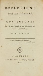 LINGUET. REFLEXIONS SUR LA LUMIERE ou conjectures sur la part qu’elle a au mouvement des corps célestes. Londres, Th. Spilsbuty, 1784. In-8 de 134 pages, demi veau blond (reliure de l’époque)