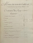 On y trouve : Etat des personnes qui doivent et ont droit de manger aux tables du Roy pendant l'année 1752. Seconde table de Monseigneur le Grand Maître. – Le Comte de Charolois, Prince du sang nommé par le Roy pour remplir toutes les fonctions de la charge de grand maitre de France. - Menu du pain de la maison du Roy pour l'année 1752. –Menu du vin de Table et commun. – Menu de la Table du Roy pour deux grands plats, deux assiettes, cinq services etc. Aussi : Page 176 : Pauvres garçons et veuves de garçons d’officiers de la maison du Roy (…) à qui sa majesté a conservé ou accordé des pensions. Puis Parties par quartiers. Une section : Memoire de la cire qui se distribue a la messe de minuit. Cire blanche. Et plus loin ire jaune. Et « Menu de ce que l’on donne au conducteur de la haquenée quand le Roy s’en sert » - « Souper du père confesseur » - « Lorsque le Roy est à l’armée ou en voyage » Suis avec un titre, les « Dépenses à faire par la Chambre aux Deniers du Roy pour les levées et nourritures en argent des personnes établies par sa Majesté pour le service de Monseigr le Duc de Bourgogne et de madame de France à employer sur le dernier cahier des dépenses Extraordinaires de chaque quartier pendant l’année 1752. »