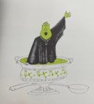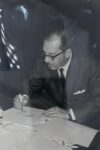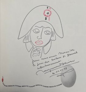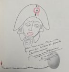 Envoi autographe signé de Raymond Oliver à Daniel Morcrette sur un feuillet de papier à lettre ; Envoi autographe signé de Raymond Oliver à Daniel Morcrette et son épouse orné d’un grand dessin en rouge et noir (Arlequin à la cocarde), photographie de Raymond Oliver dessinant.