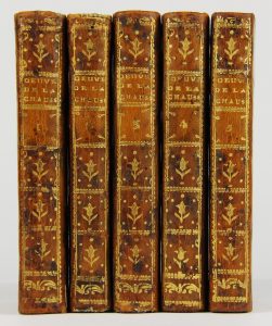 NIVELLE DE LA CHAUSSEE. ffiUVRES. Paris, Duchesne, 1777. 5 vol. in-12, veau marbré, dos lisse orné (Reliure de l’époque)