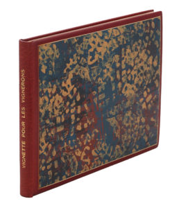 Paris, Falaize, 1951. In-8 oblong, maroquin bordeaux, plats de papier à large décor automnal, tranches dorées, couvertures et dos conservés ; chemise et étui bordé de même (D. Saporito).Édition originale de ce poème lu par André Verdet le jour de la fête des raisins à Saint-Jeannet de Provence.
