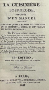 [RAIMBAULT, pseudonyme de COUSIN D’AVALLON]. La Nouvelle cuisinière bourgeoise, contenant 1° Les recettes générales et particulières pour faire une bonne cuisine à peu de frais... Huitième édition. Par l’auteur du Parfait cuisinier. Paris, Locard et Davi, 1821. In-12 broché. Frontispice, 286 pp.