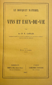 CARLES (Dr P.). Le Bouquet naturel des vins et eaux-de-vie. Bordeaux et Paris, 1897. In-8, bradel cartonnage ocre, pièce de titre en long, couverture (Lobstein-Laurenchet). Édition originale. De la bibliothèque Kilian Fritsch (1993, n°141), avec ex-libris.