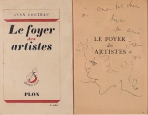 [COCTEAU]. Deux envois dont un accompagné d'un dessin original de Jean Cocteau. • La Belle et la Bête. Journal d'un film. J. B. Janin. & •• Le Foyer des artistes. Plon. Encadrés avec la couverture et le livre (?). • « à Georges Marny de tout coeur Jean » et •• « à mon très cher duc son ami Jean 1947 ».