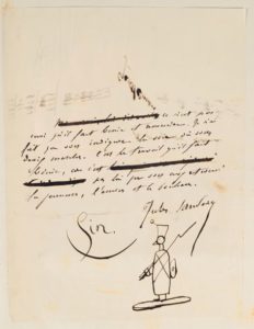 SANDEAU (Jules). « Madeleine ». Manuscrit autographe signé et daté de 1846 en un volume in-folio, demi-chagrin noir, supra-libris doré « Mme Eulalie. Dethou » ornant le premier plat, dos lisse orné de caissons à froid, doublure et garde de moire blanche (Bourra, Relieur à Sancerre). 126 ff. contrecollés, avec de nombreux repentirs ; accompagnés de quelques placards et DESSINS ORIGINAUX. MANUSCRIT AUTOGRAPHE SIGNÉ du roman Madeleine « commencé le 12 mai 1846 » et « fini le 31 juillet 1846. », qui sera publié en 1848. De la bibliothèque du Marquis de L'Aigle, avec ex-libris. Provenance : « Manuscrit relevé pour Mme Eulalie Dethou à Cosne sur Loire. », et « acheté le 30 mai 1891. » Rousseurs atteignant parfois le manuscrit. PRÉCIEUX DOCUMENT QUI PERMETTRAIT DE CONFIRMER JULES SANDEAU COMME VÉRITABLE AUTEUR DE L'OUVRAGE.