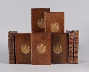 BOULAINVILLIERS (Henri de ). La vie de Mahomed ; avec des Réflexions sur la Religion Mahometane, & les Coutumes des Musulmans. A Amsterdam, Chez François Changuion, 1731. 2 parties en un volume in-12, maroquin olive, filet doré encadrant les plats, fleuron aux angles, armoiries au centre, dos à nerfs orné, tranches dorées (reliure de l'époque). « Seconde Edition. » Un titre-frontispice et neuf planches (dont une portant la mention « Frontispice IIe partie ». Exemplaire enrichi de quatre portraits supplémentaires repliés, gravés par Étienne Jehandier DESROCHERS et PETIT. Dos passé ; légères décharges, mais, BEL EXEMPLAIRE dans une reliure EN MAROQUIN OLIVE AUX ARMES du DUC de La ROCHEFOUCAULD.