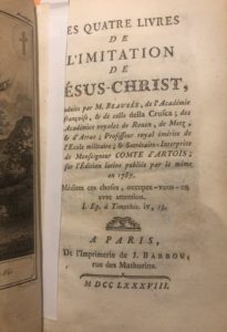 [IMITATION de JÉSUS CHRIST]. Les Quatre livres de l'Imitation de Jésus-Christ. Traduits par M. Beauzée . A Paris, De l'Imprimerie de J. Barbou, 1788. In-12, maroquin rouge, triple filet doré encadrant les plats, dos lisse orné, tranches dorées (reliure de l'époque). Un frontispice et quatre planches gravés par PREVOST d'après LE SUEUR et COCHIN fils. Ex-dono manuscrit en page de garde. Joint : canivets et images pieuses.