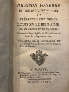 La LUZERNE (César-Guillaume de ). Oraison funebre de très-haut, très-puissant et très-excellent prince, Louis XV le Bien-Aimé, Roi de France et de Navarre, Prononcée dans l'Eglise de Notre-Dame de Paris, le 7 Septembre 1774. A Paris, De l'Imprimerie de Guillaume Desprez, 1774. In-12, toile grise, pièce de titre en long, couverture conservée (reliure moderne). 68 pp.