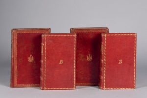 OVIDE. Oeuvres [...]. Tome premier contenant ses Amours, son Art d'Aimer et ses Élégies écrites de Pont [...] Tome second contenant son Remede d'Amour, ses Fastes et ses Tristes. S. l., Édition Royale, 1750. 2 volumes in-8°, maroquin rouge, fine roulette dentelée encadrant les plats, chiffre « B L » au centre des premiers, dos à nerfs orné, tranches dorées (reliure prussienne de l'époque). Vignette répétée sur les titres, gravé par Pieter TANJÉ. Dans l'exemplaire conservé à la Bibliothèque nationale de France, une note manuscrite indique que ce sont les « Titre et préface d'une traduction d'Ovide faite par ordre du roi de Prusse ». BEL EXEMPLAIRE dans une reliure EN MAROQUIN ROUGE.