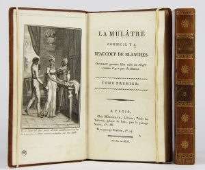 [Anonyme]. LA MULATRE COMME IL Y A BEAUCOUP DE BLANCHES. Ouvrage pouvant faire suite au Nègre comme il y a peu de Blancs. Paris, Marchand, an XI (1803). 2 vol. in-12, basane fauve, dos lisse orné (Reliure de l’époque)