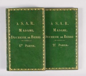 [OPHTALMOLOGIE - FORLENZE (Joseph-Nicolas-Blaise)]. • [JAUFFRET (Louis- François)]. Notice sur le développement de la lumière et des sensations, dans les aveugles-nés, a la suite de l'opération de la cataracte, Faite par le Docteur Forlenze, Chirurgien-Oculiste. Paris, Imprimerie d'Ant. Bailleul, 1820. •• [C......Y (de)]. Relation des opérations et des expériences faites a Colmar par le célèbre Oculiste Forlenze, sur neuf aveugles affectés de cataractes et sur deux aveugles de naissance ; suivie d'Observations analytiques sur l'éducation, les progrès de l'organe de la Vue, et le développement de ses facultés en rapport avec la lumière. Colmar, Chez J. H. Decker, Imprimeur, 1817. 2 volumes in-8°, maroquin vert à grains longs, fine roulette dentelée dorée encadrant les plats, ex-dono sur les premiers « À S. A. R. Madame, Duchesse de Berri. Ire [& 2e] Partie. », dos lisse orné, tranches dorées (A. Berthe, relieur). • « Troisième édition. Augmentée de plusieurs Observations. » Des bibliothèques de Rosny (390 et 391) et de Juigné Béné, avec ex-libris. Dos passés. TRÈS BEAUX EXEMPLAIRES EN MAROQUIN VERT relié pour MARIE-CAROLINE de BOURBONSICILE (1798-1870), DUCHESSE DE BERRY. ENSEMBLE DEUX VOLUMES.