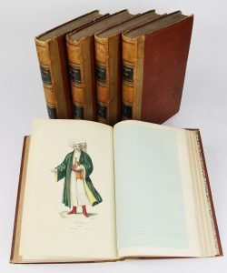 Recueil des descriptions pittoresques, des récits curieux, des découvertes... de Christophe Colomb à Dumont d’Urville. L’ouvrage est illustré de 90 remarquables planches hors texte gravées par Choubard et délicatement coloriées à l’époque, montrant des types costumés du monde entier, et 8 cartes à double page montées sur onglets. Les coloris sont très frais. Rousseurs claires sur le texte, affectant très rarement les figures. Frottis aux dos.