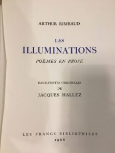 RIMBAUD (Arthur). Les Illuminations. Poèmes en prose. S. l. [Paris], Les Francs Bibliophile, 1966. Petit in-4°, en feuilles, sous couverture, chemise et étui de l'éditeur. Eaux-fortes, certaines sur double page, par Jacques HALLEZ. Tiré à 170 exemplaires sur pur chiffon d'arches, celui-ci (n° 11), imprimé pour M. Henri Besson.