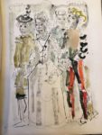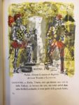 SHAKESPEARE. La Sauvage apprivoisée. Traduction de François-Victor Hugo. S. l. [Paris], Les Francs-Bibliophiles, 1957. In-folio, maroquin vert sombre, filets à froid et large décor géométrique mosaïqué ornant les plats, titre en box mosaïqué sur le premier, dos lisse orné du même décor, tranches dorées, doublures et gardes de box gris, couverture illustrée en couleurs conservée, chemise et étui (P. L. Martin - 1959). Lithographies en couleurs, certaines à pleine page, par Paul AÏZPIRI. Tiré à 150 exemplaires sur pur chiffon de lana, celui-ci (n° 11), imprimé pour M. Henri Besson, contenant l'une des dix suites sur japon et un second état de la couverture. EXEMPLAIRE ENRICHI DU DESSIN ORIGINAL AQUARELLÉ ET SIGNÉ de l'illustration de la page 79. JOINT : le menu illustré en couleurs du dîner du 20 juin 1957, avec envoi de l'artiste. Dos de la chemise passé ; légères décharges. TRÉS BEL EXEMPLAIRE dans une RELIURE MOSAÏQUÉE de Pierre-Lucien MARTIN .